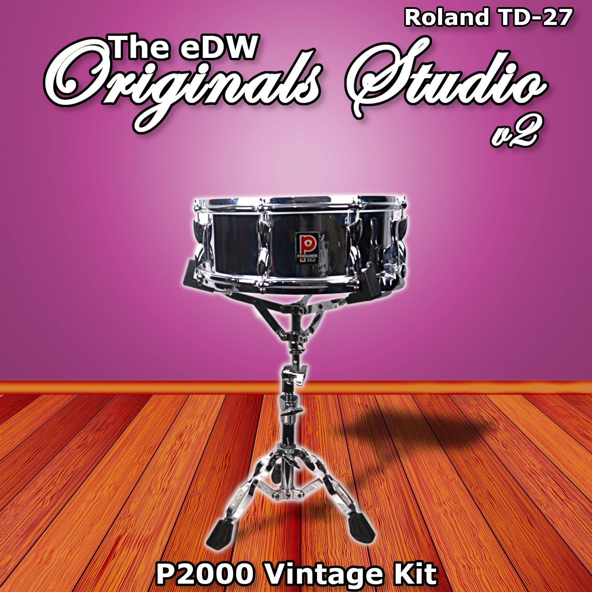 This kit contains user samples of a Premier 2000 14x5 chrome over aluminum snare drum on the snare head & rim.